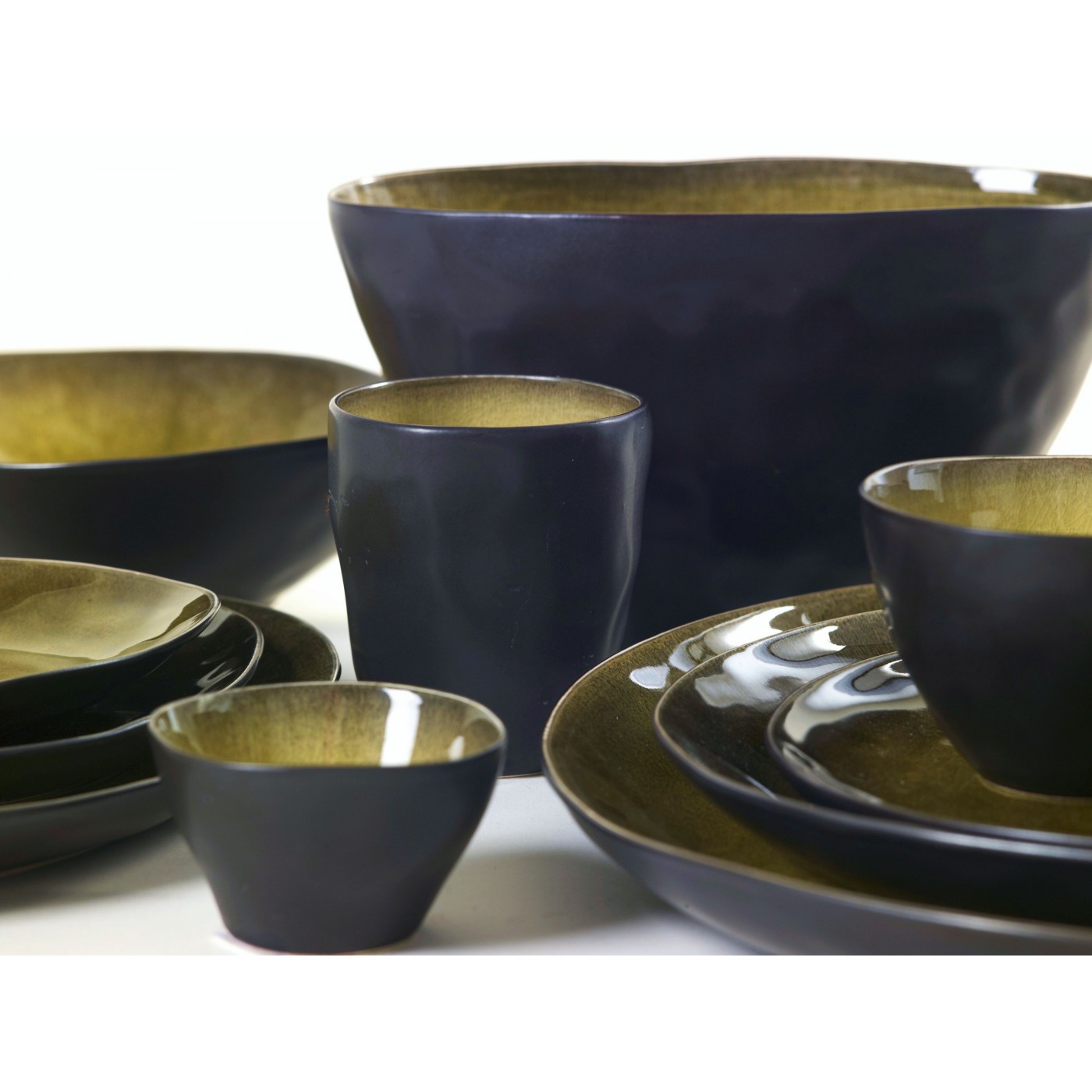 Pure is a collection of plates, dishes, bowls and cups with slightly irregular round or oval shape with an iridescent and finely crackled enamel of green or brown shades, contrasting black matte exterior.