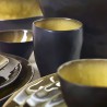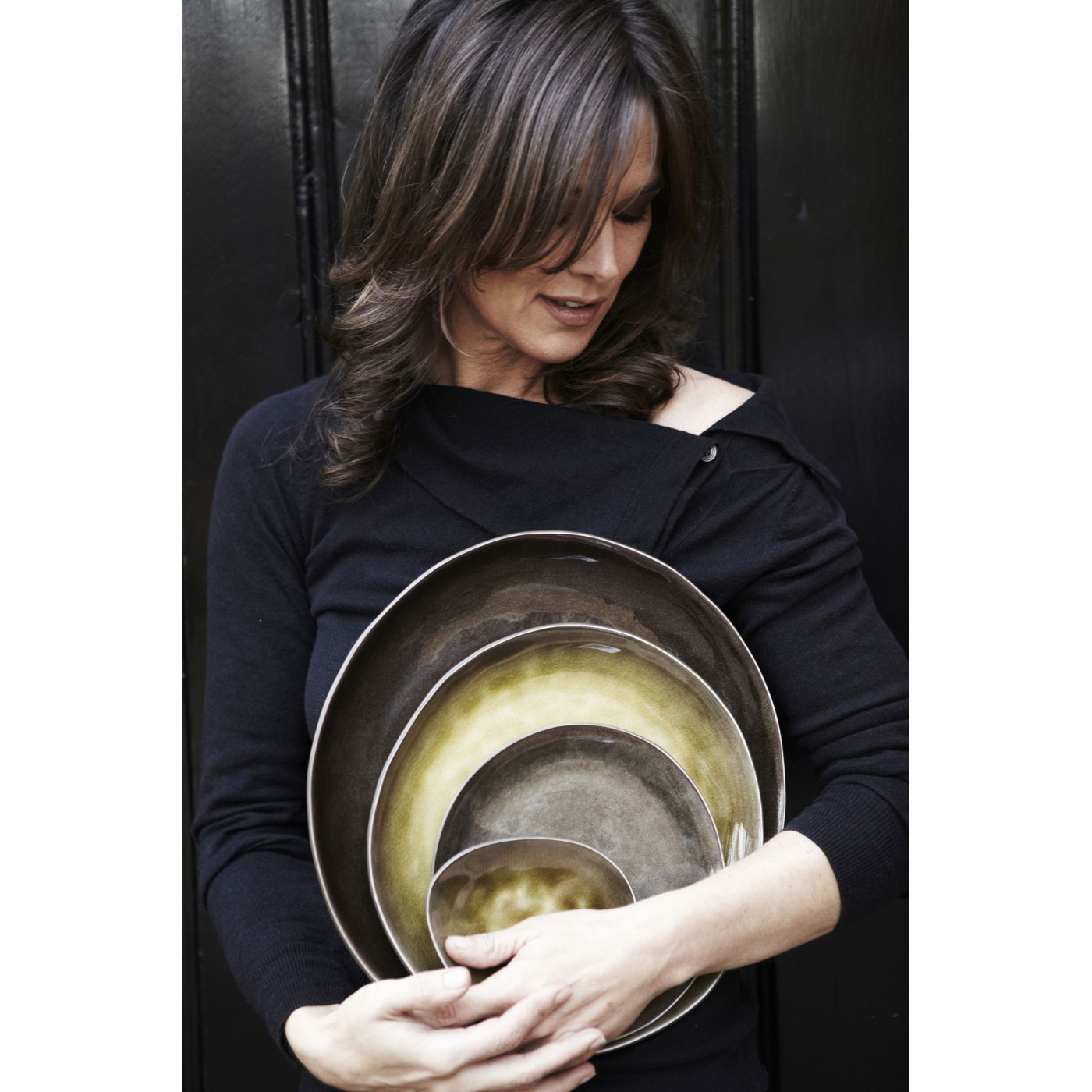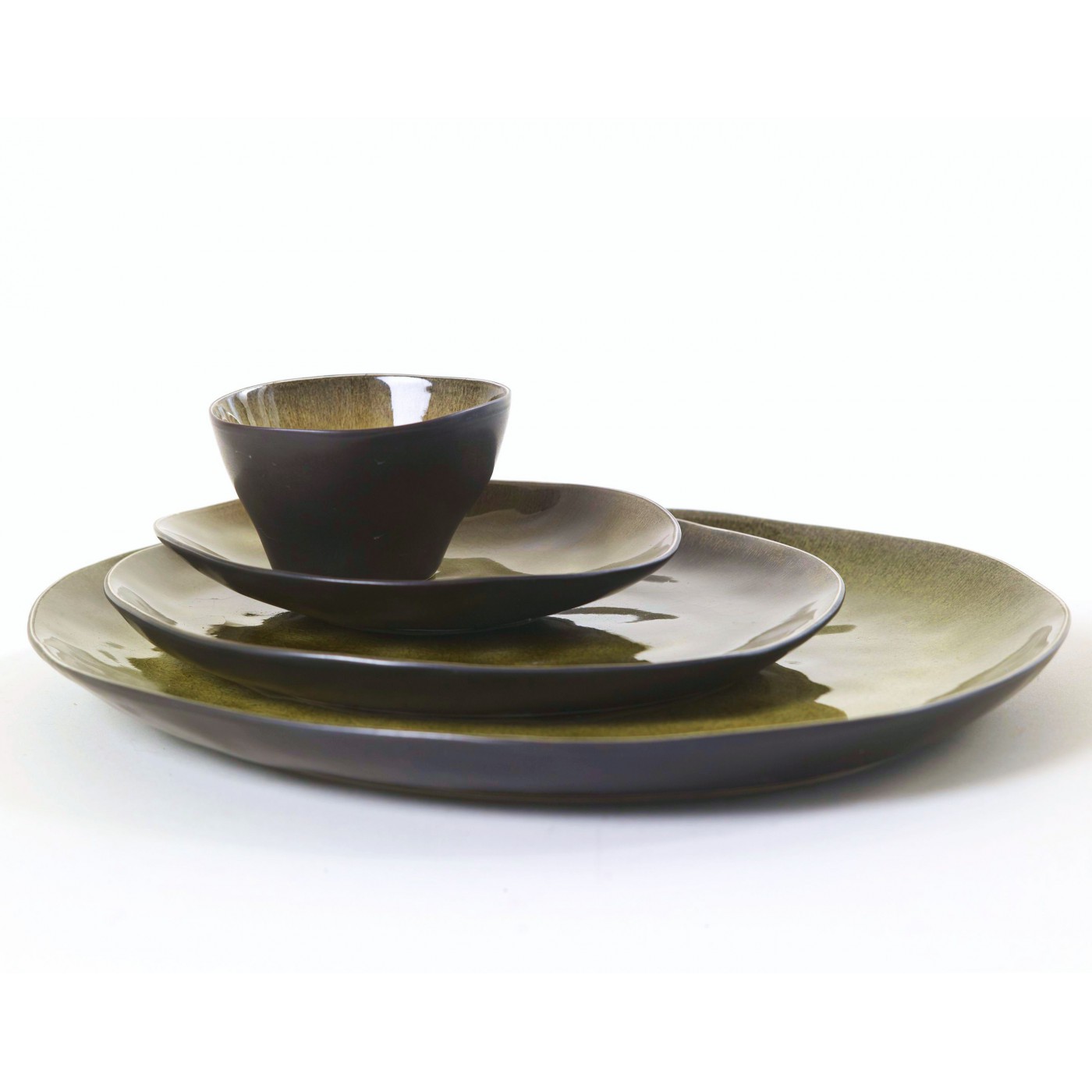 Pure is a collection of plates, dishes, bowls and cups with slightly irregular round or oval shape with an iridescent and finely crackled enamel of green or brown shades, contrasting black matte exterior.