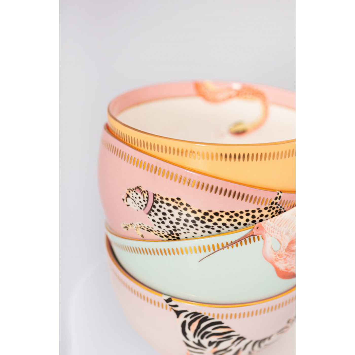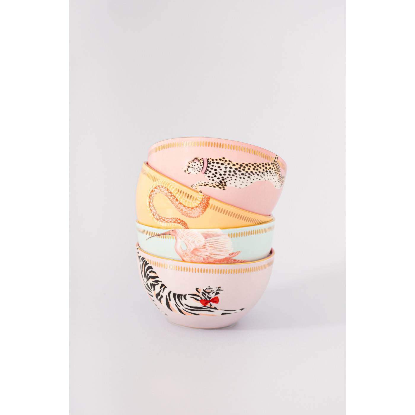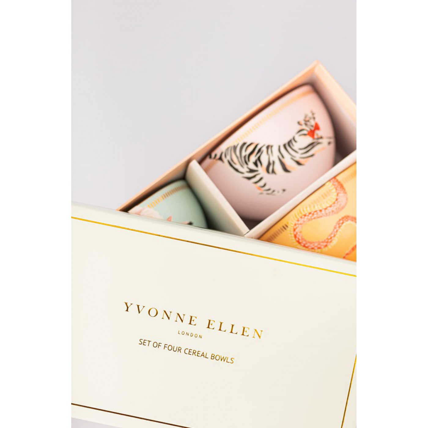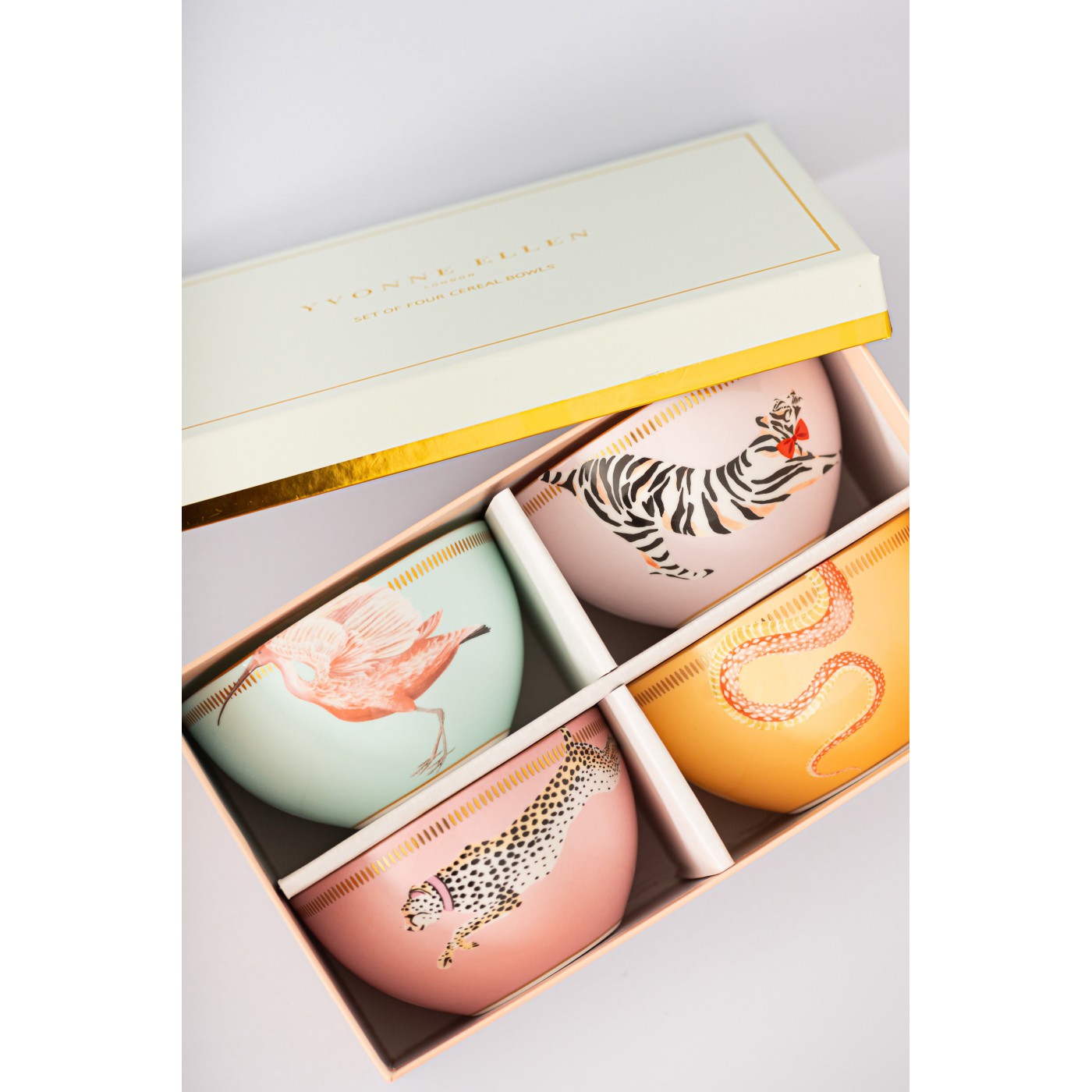 Ce set original incarne parfaitement le style Yvonne Ellen : des animaux emblématiques dans des compositions colorées et ludiques. Les bols à céréales pastel sont ornés de quatre animaux adorables, rehaussés de détails dorés qui apportent une touche funky, parfaite pour égayer vos repas.
