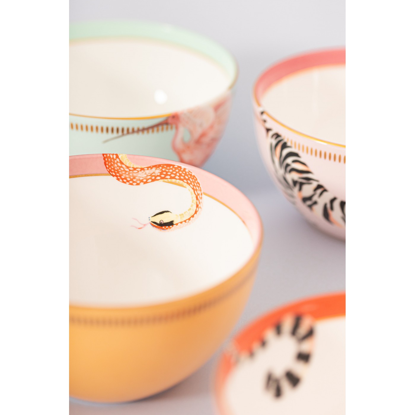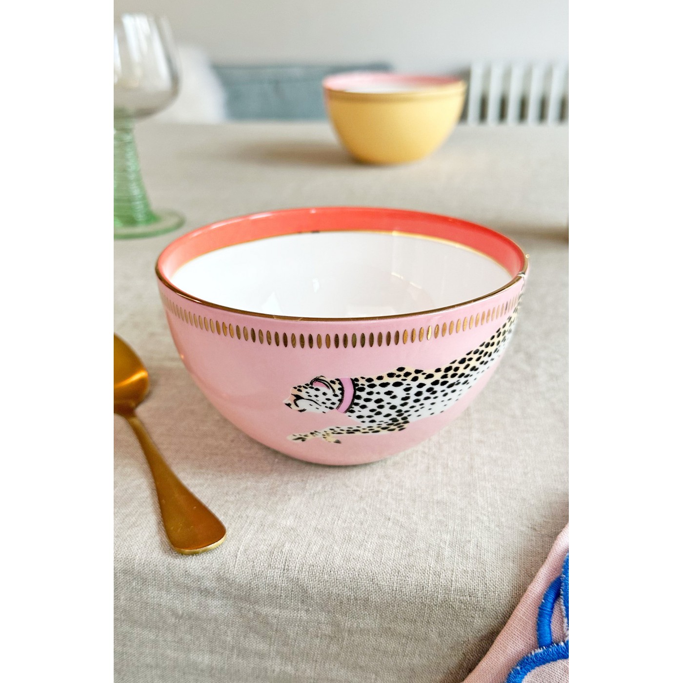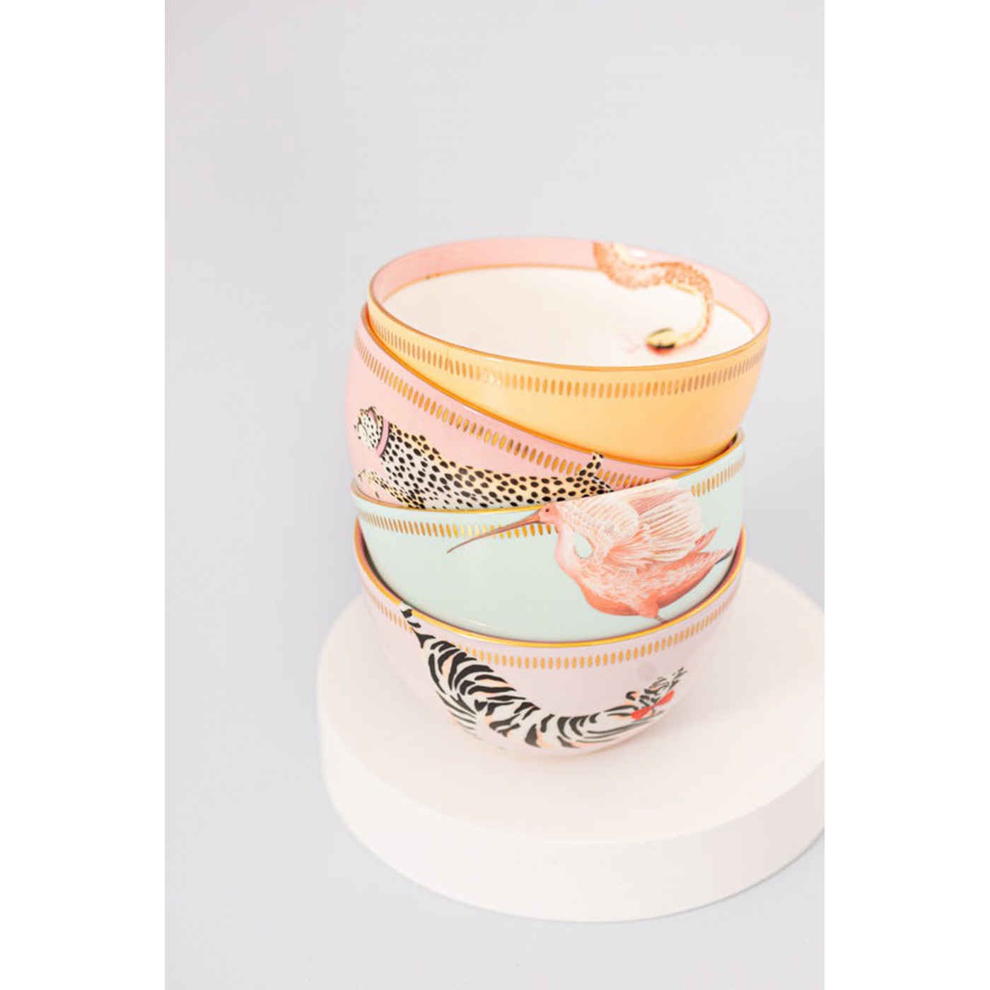 Ce set original incarne parfaitement le style Yvonne Ellen : des animaux emblématiques dans des compositions colorées et ludiques. Les bols à céréales pastel sont ornés de quatre animaux adorables, rehaussés de détails dorés qui apportent une touche funky, parfaite pour égayer vos repas.
