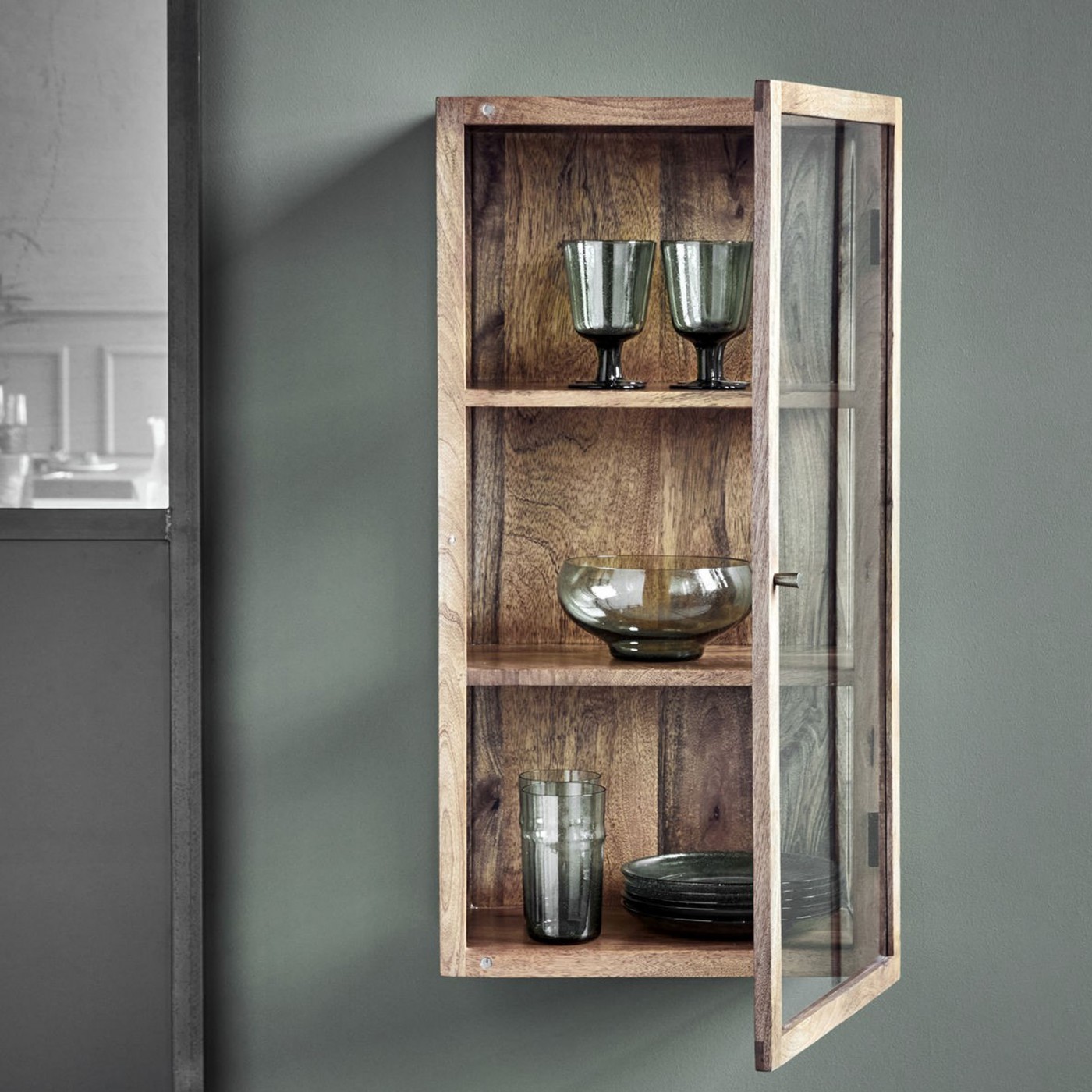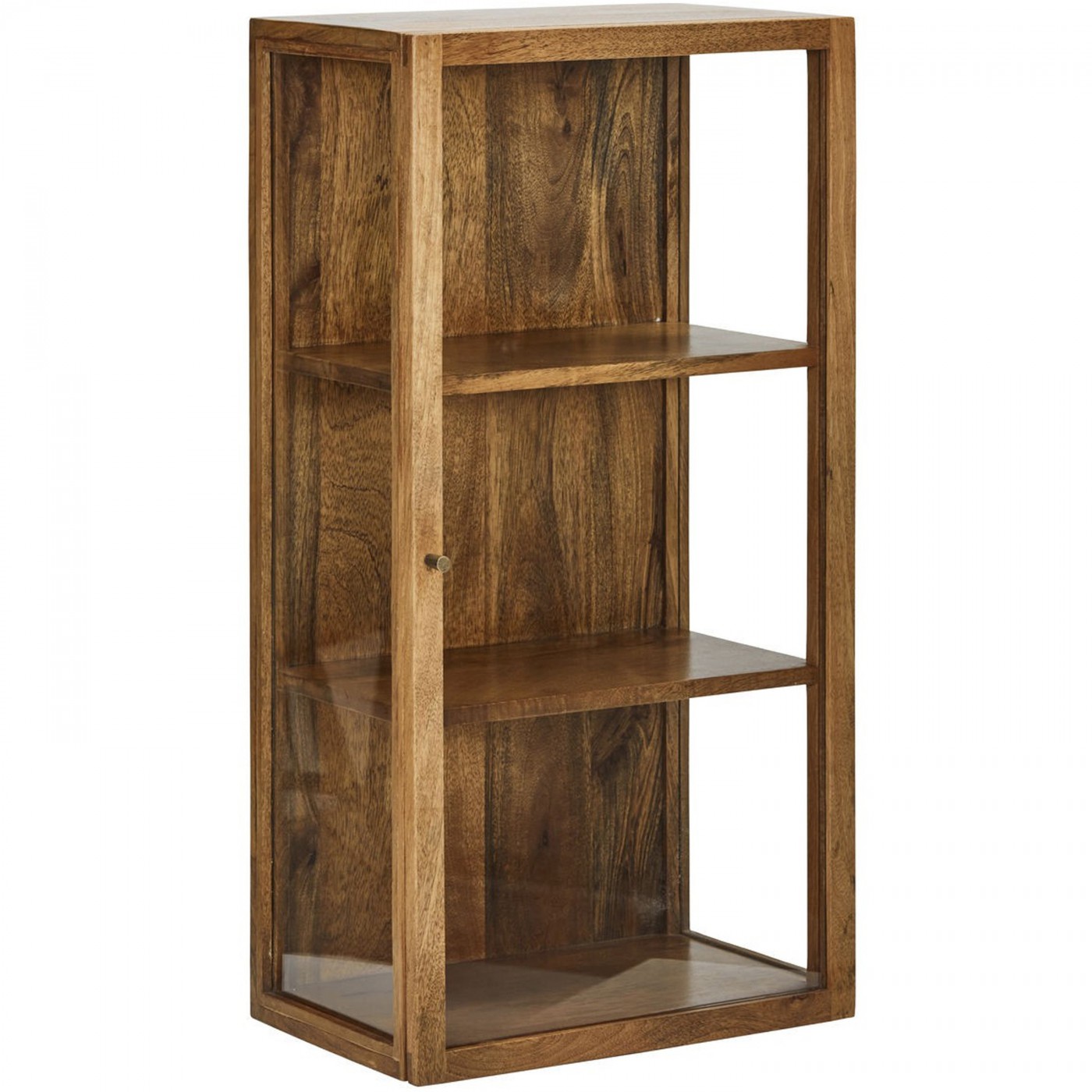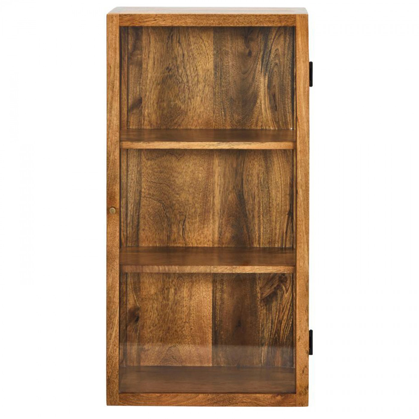 Elevate your interior decor with this elegant wall cabinet, crafted from natural mango wood and fitted with tempered glass panels. This refined piece features three spacious shelves, ideal for displaying your favorite items while bringing a touch of sophistication to your space. The small metal handle adds a subtle but elegant detail, perfectly complementing its design. Combining charm and functionality, this cabinet is the perfect addition to enhance any room in your home.