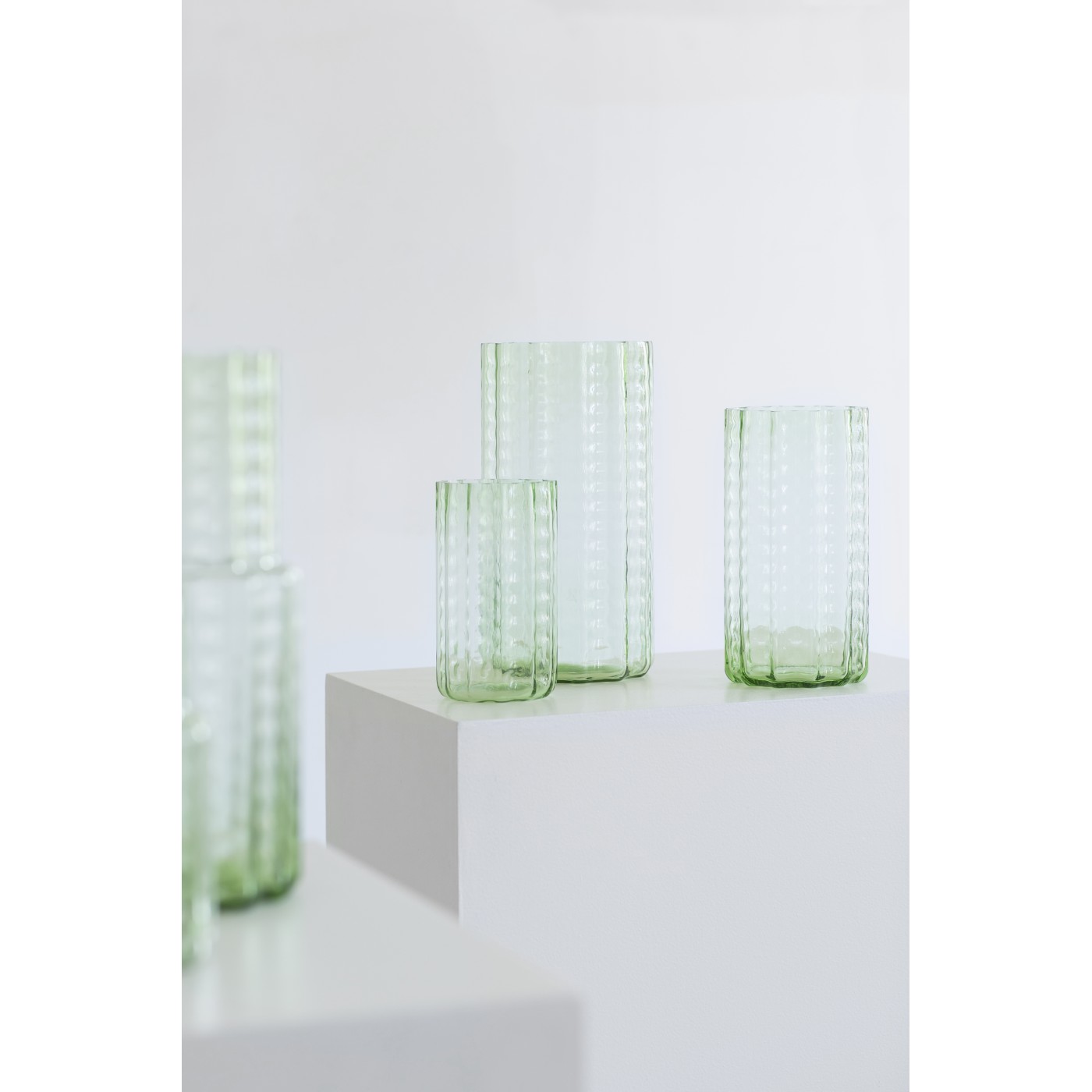 Wave is a collection of blown glass vases inspired by the windows of the Museum Aan de Stroom in Angers. The characteristic shapes of the glass give them a unique texture and appearance