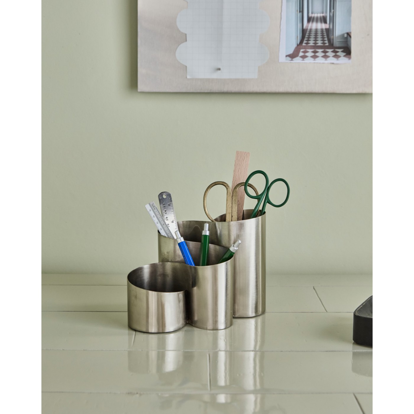 Apportez organisation et élégance à votre bureau avec cet organisateur en fer. Sa silhouette incurvée et sa finition argentée mouchetée en font un objet à la fois sculptural et pratique, parfait pour ranger stylos, accessoires et petits objets du quotidien. Alliant robustesse et design raffiné, il transforme votre espace de travail en un coin à la fois fonctionnel et décoratif.