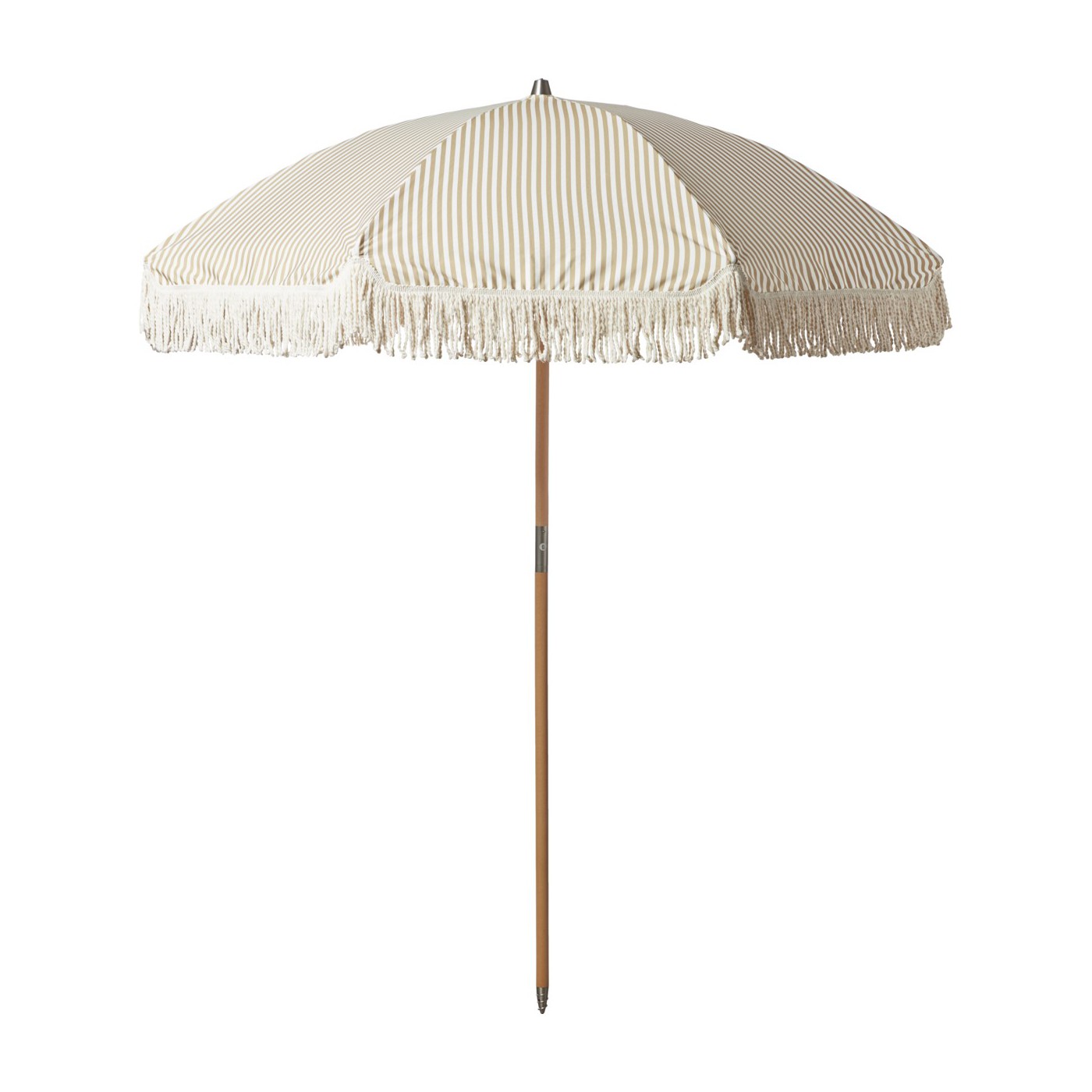 Profitez pleinement d'une journée d'été à l'ombre avec ce parasol de jardin Umbra de House Doctor. Ses rayures intemporelles en blanc et sable, associées à de longues franges épaisses, apportent une touche de vintage à votre extérieur. Ce parasol s'harmonise parfaitement avec des meubles en bois, béton ou métal, tout en ajoutant une touche raffinée à votre terrasse. Le mât en bois démontable permet de le ranger facilement dans son sac, vous offrant ainsi la possibilité de l'emporter lors de vos sorties ou journées à la plage.