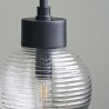 The handcrafted ribbed glass shade adds a tactile touch to the round suspension, while the iron top finishes the design on an industrial note.