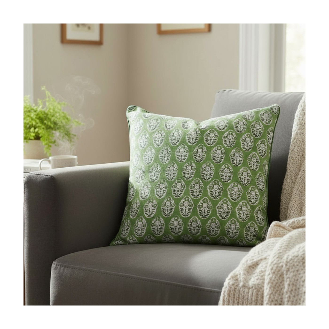 La housse de coussin en coton Celadon séduit par son imprimé délicat aux motifs floraux stylisés, sublimés par un fond vert frais et lumineux. Son passepoil assorti souligne ses contours avec finesse, apportant une touche de finition élégante. Douce et confortable, elle trouve aisément sa place sur un canapé ou un lit, insufflant fraîcheur et harmonie à votre décoration intérieure.