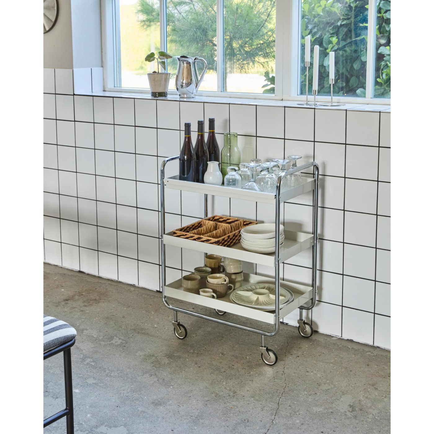 Le chariot Roll allie praticité et style avec son design industriel en acier et sa finition argentée moderne. Polyvalent, il sert de desserte, de rangement d’appoint ou de présentoir pour vos objets décoratifs. Ses roulettes robustes facilitent le déplacement, tandis que ses étagères offrent un espace fonctionnel et organisé, apportant à la fois utilité et caractère à votre intérieur.