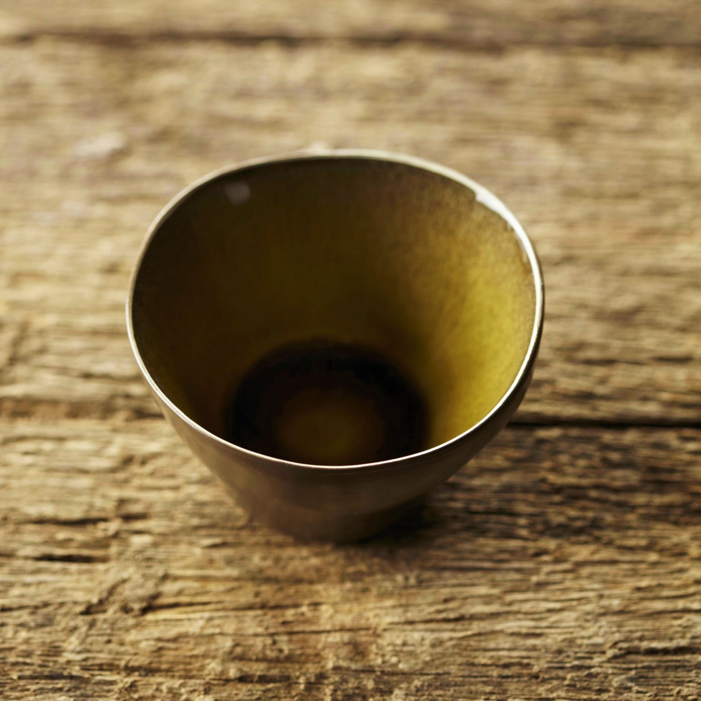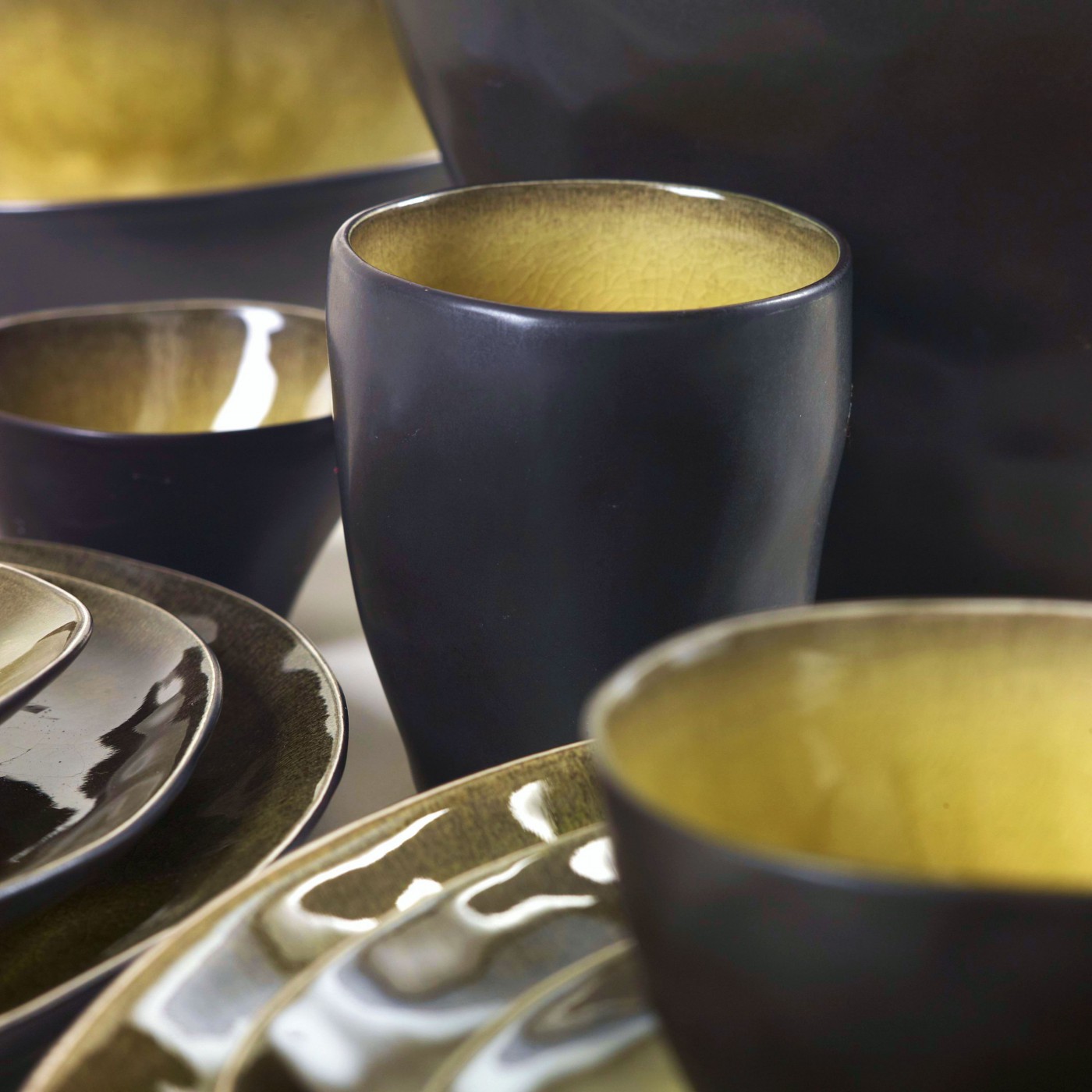 Pure est une Collection d'assiettes, plats, bols, tasses, et saladiers de forme ronde ou ovale légèrement irrégulière avec un émail de nuances de vert ou marron, irisé et finement craquelé, extérieur contrastant noir mat.