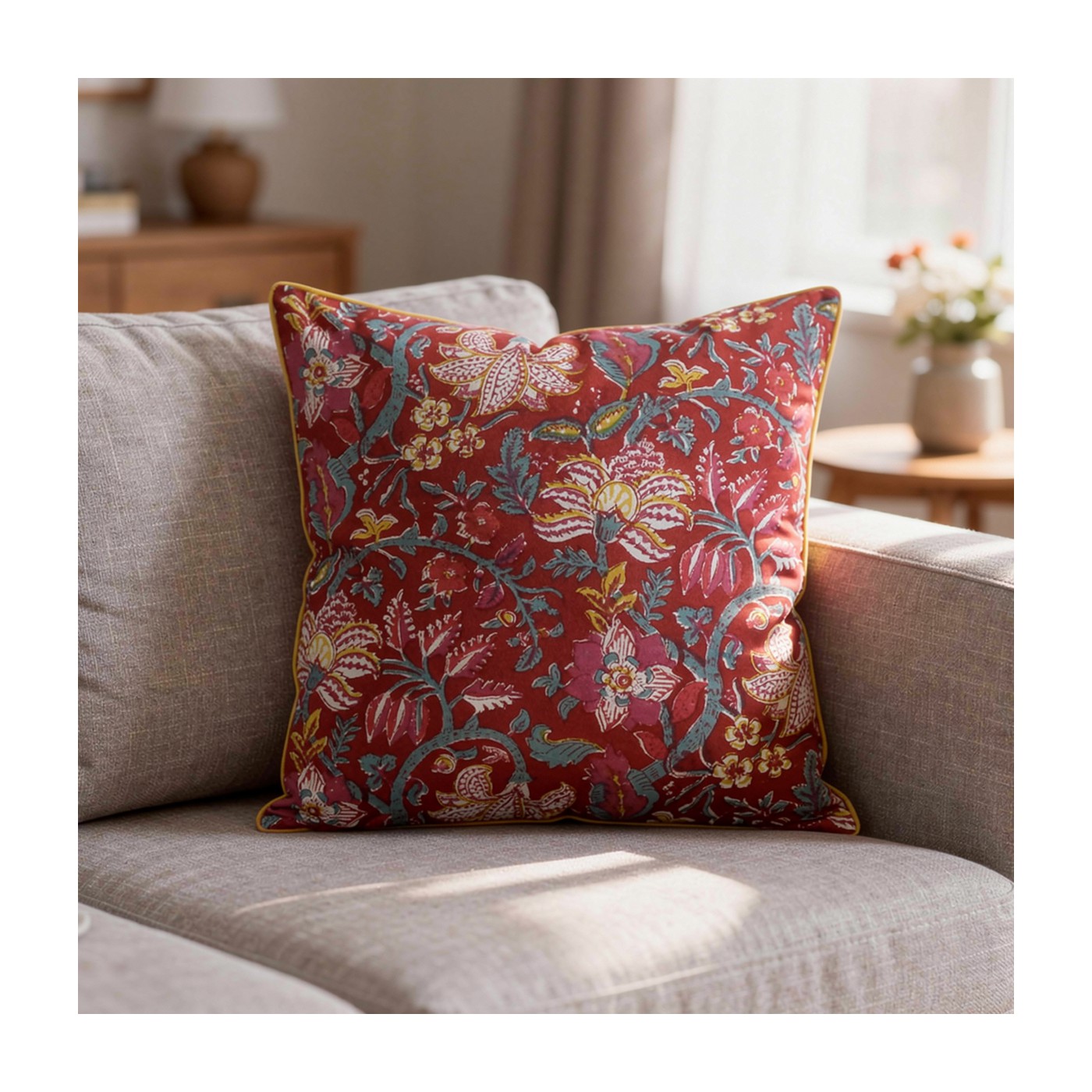 La housse de coussin en coton Anarkali de chez ARCHIV Collection séduit par son imprimé floral éclatant, sublimée par un fond rouge profond qui attire le regard. Son tissu doux et naturel apporte confort et élégance à votre intérieur.