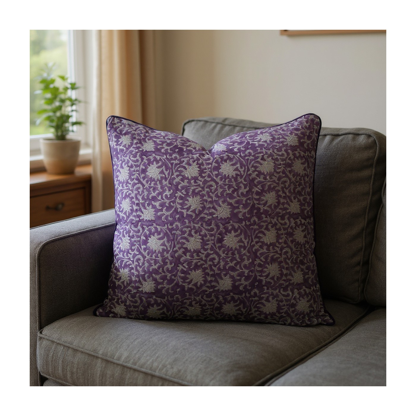 La housse de coussin en coton Noura de chez ARCHIV Collection séduit par son imprimé raffiné aux motifs floraux délicats sur fond violet. Son passepoil assorti souligne ses lignes avec élégance et lui apporte une finition soignée.