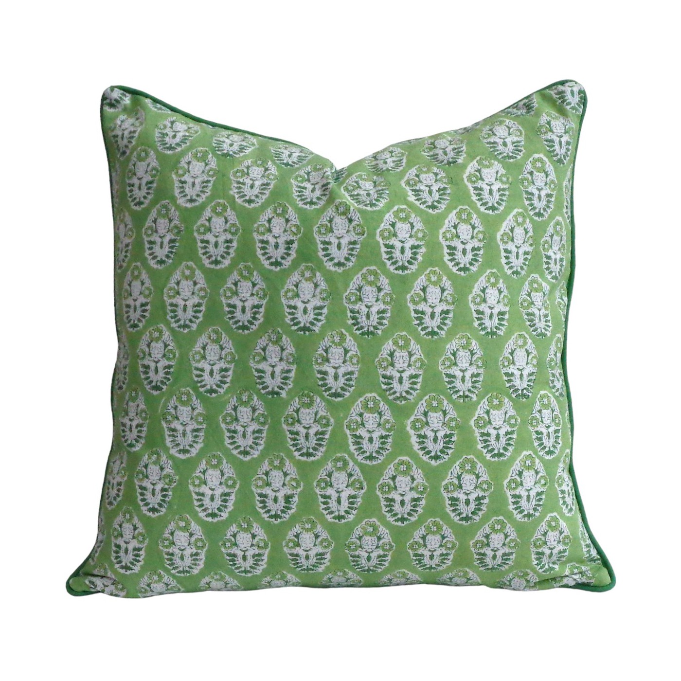 La housse de coussin en coton Celadon de chez ARCHIV Collection séduit par son imprimé délicat aux motifs floraux stylisés, sublimés par un fond vert frais et lumineux. Son passepoil assorti souligne ses contours avec finesse, apportant une touche de finition élégante.