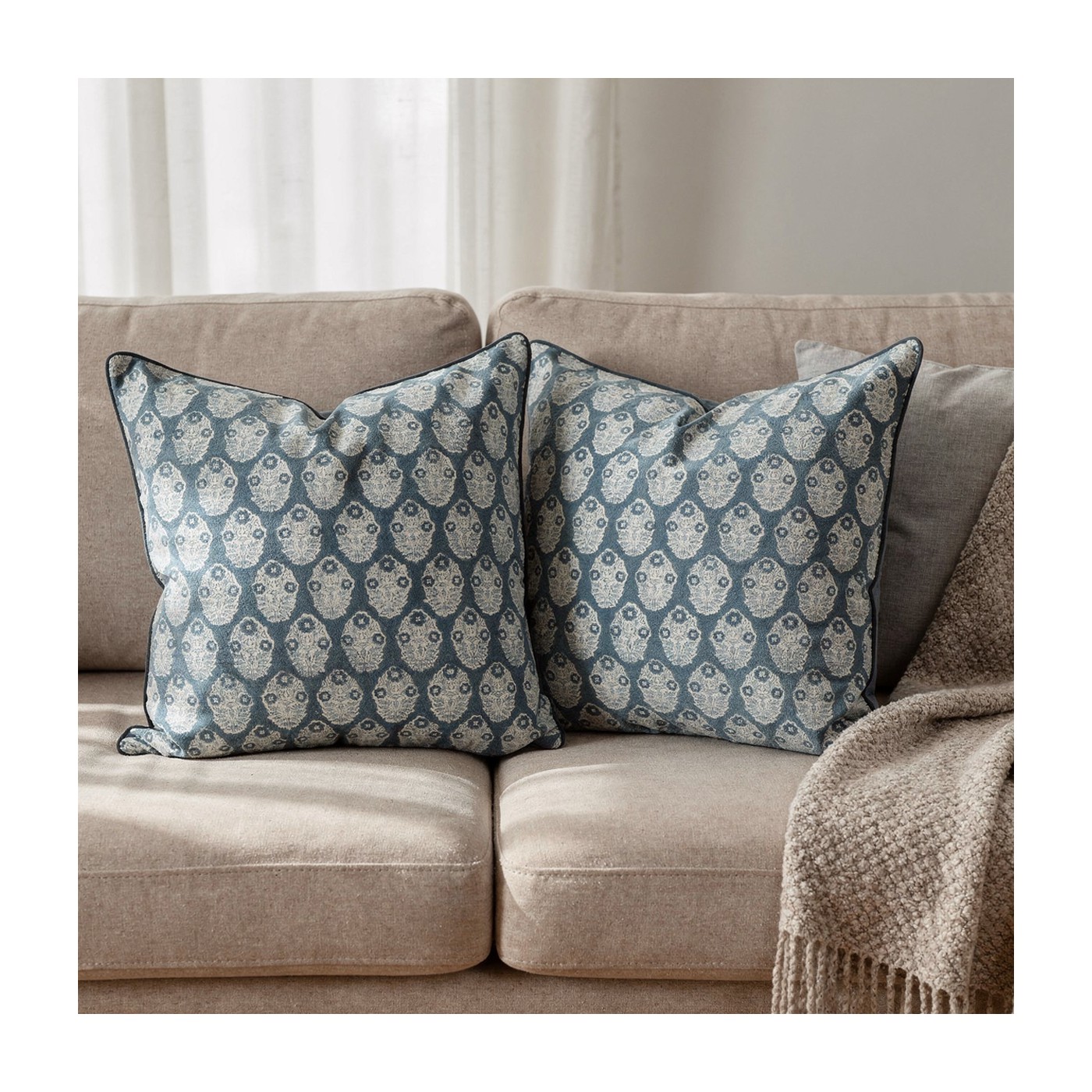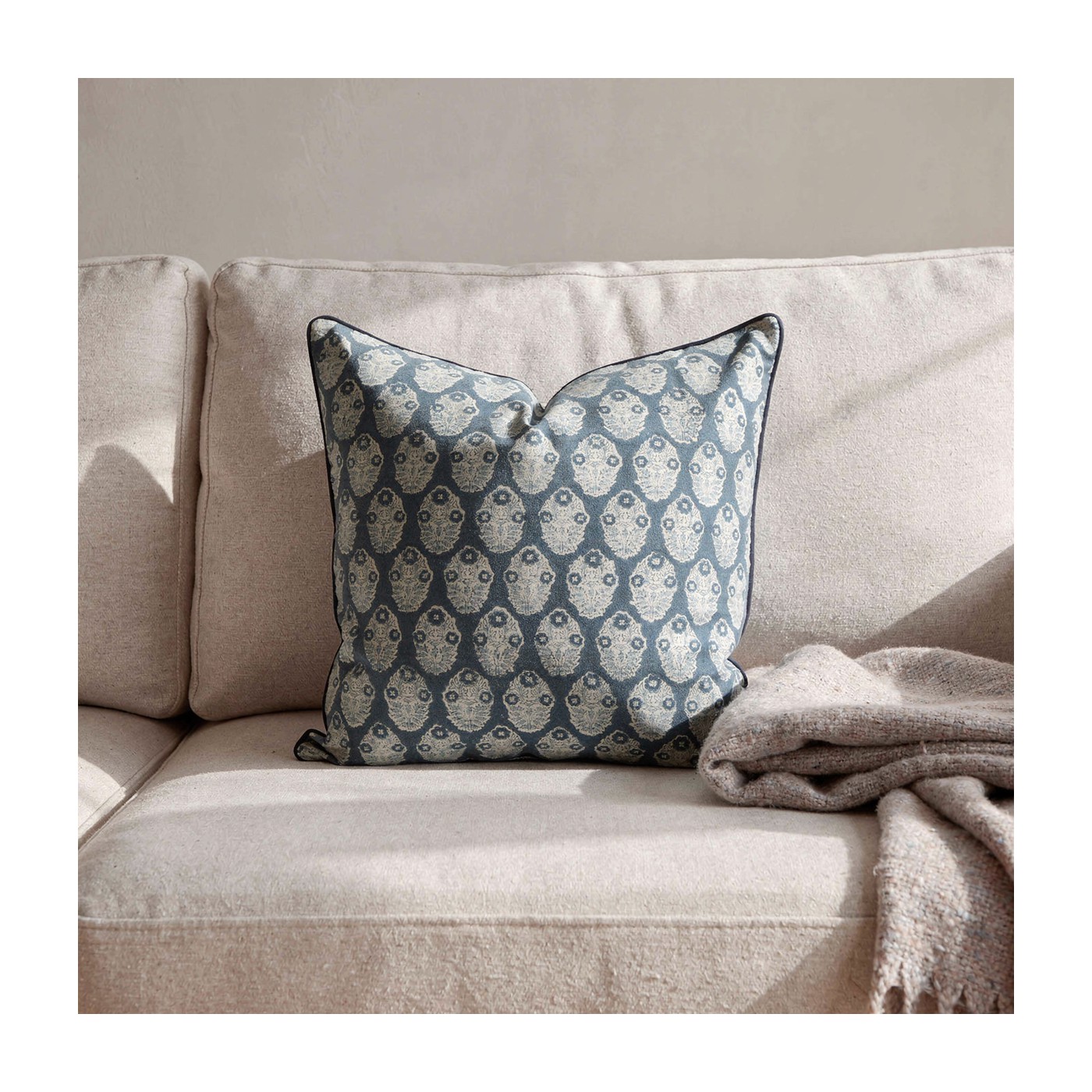 La housse de coussin en coton Aster de chez ARCHIV Collection séduit par son imprimé délicat aux motifs floraux stylisés, sublimés par un fond bleu profond. Son passepoil assorti souligne ses contours avec finesse, apportant une touche de finition élégante.