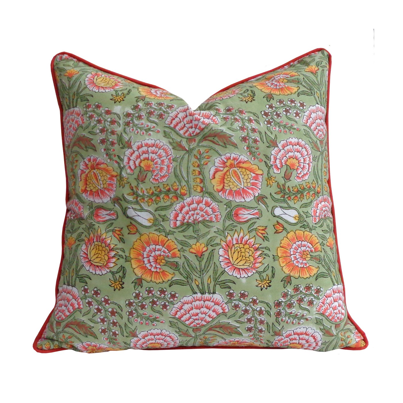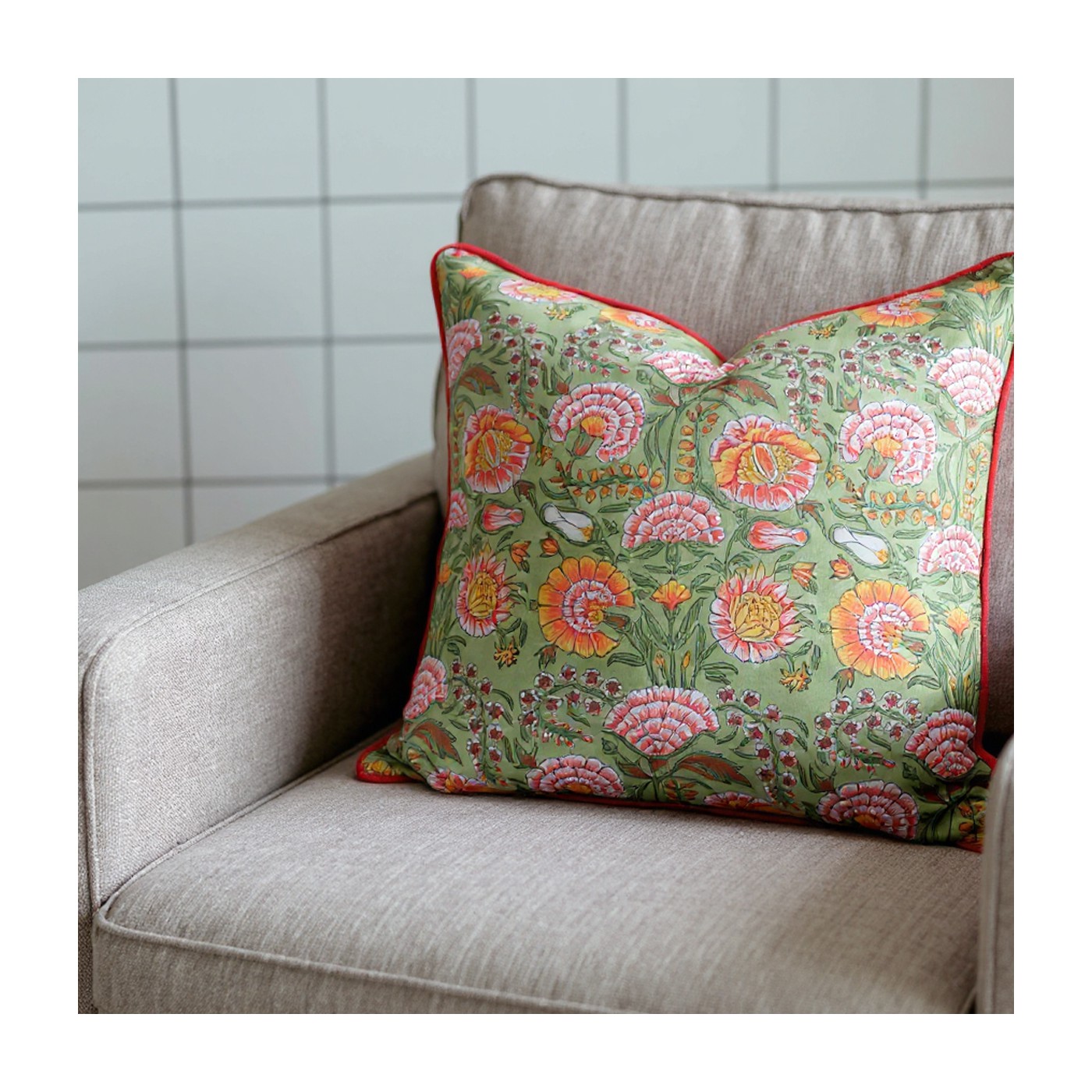 La housse de coussin Reshma de chez ARCHIV Collection illumine votre intérieur avec son fond vert clair ponctué de fleurs rouge orangé, relevé d’un élégant passepoil orange. Son imprimé vibrant et son tissu en coton doux apportent fraîcheur et vitalité à votre décoration.