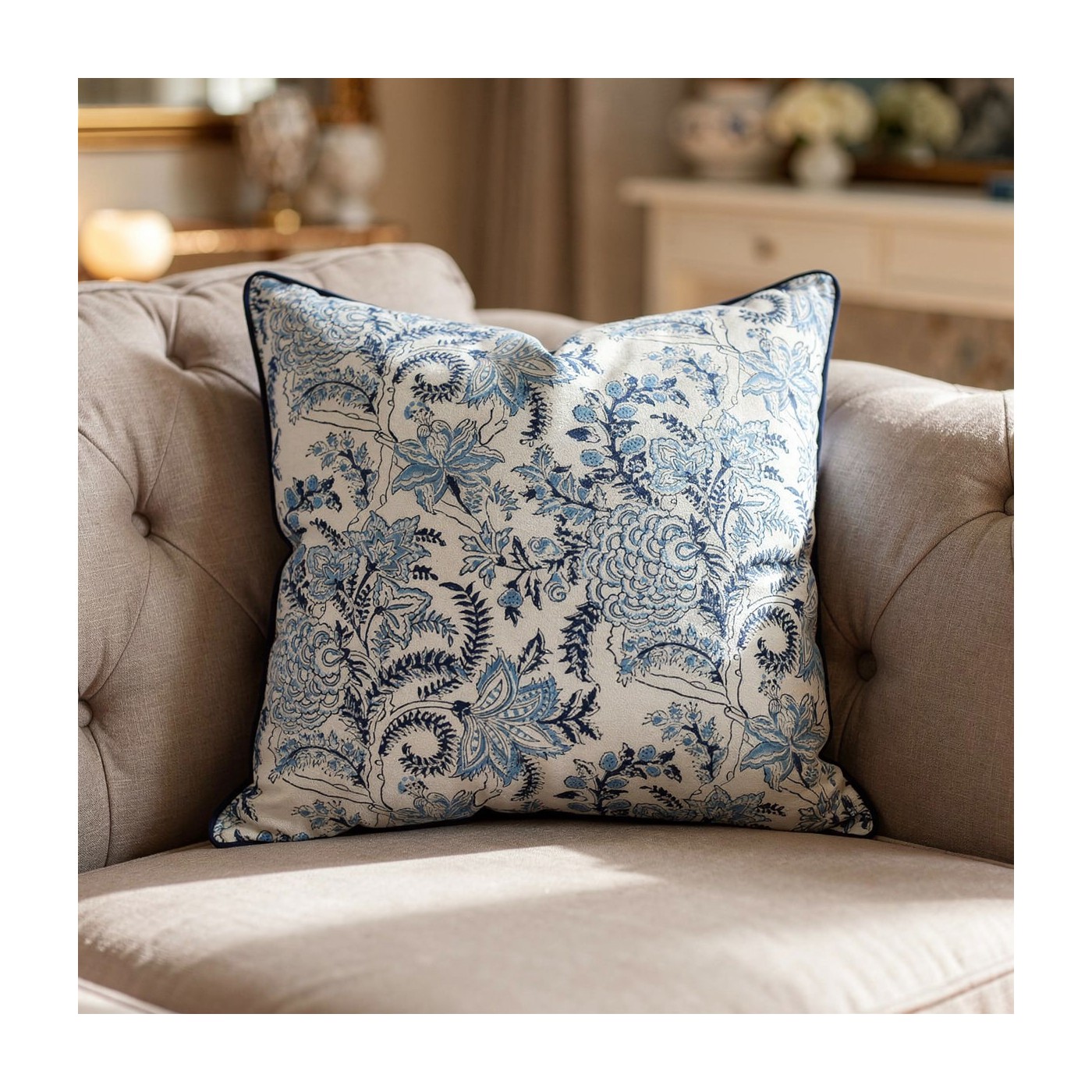 Sublimez votre intérieur avec cette housse de coussin en coton au motif Bela Palace, alliant beige et bleu pour une ambiance chic et raffinée. Imprimée sur les deux faces, elle apporte profondeur et style à votre canapé, fauteuil ou lit.