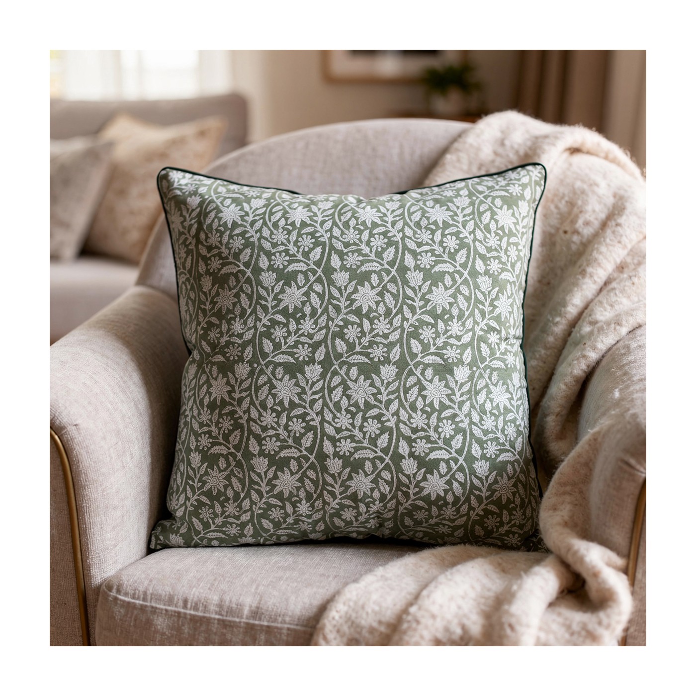 Apportez une élégante note naturelle à votre décoration avec cette housse de coussin en coton au motif Mogra aux tons blanc et kaki, imprimé sur les deux faces pour un rendu équilibré et visuel. Dotée d’une fermeture zip pratique et d’un passepoil soigné, elle allie confort et finition raffinée.