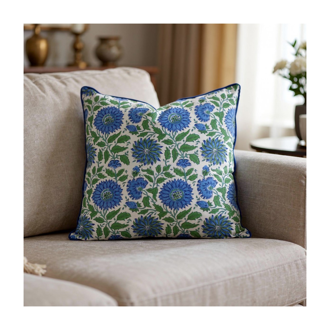 Apportez une touche de fraîcheur à votre décoration avec cette housse de coussin en coton au motif Mukhi, mêlant blanc, bleu et vert pour un style dynamique et élégant. Dotée d’une fermeture zip pratique et d’un passepoil raffiné, elle se pose facilement sur un canapé, un fauteuil ou un lit pour enrichir votre intérieur.