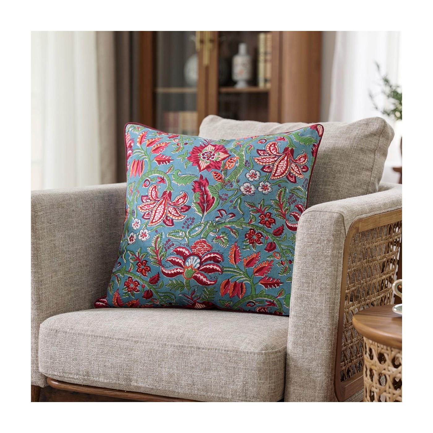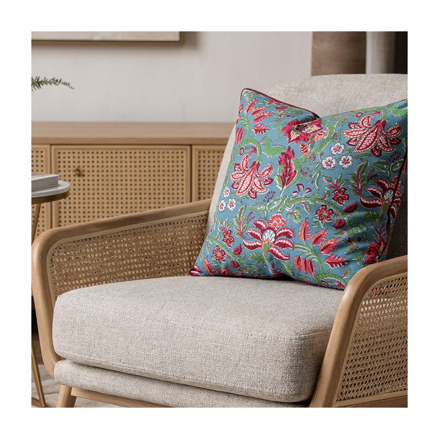 Cette housse de coussin en coton Naraya séduit par son imprimé floral délicat. Les fleurs stylisées et les feuillages apportent fraîcheur et douceur à votre décoration. Son passepoil rouge souligne élégamment les contours et met en valeur le motif.