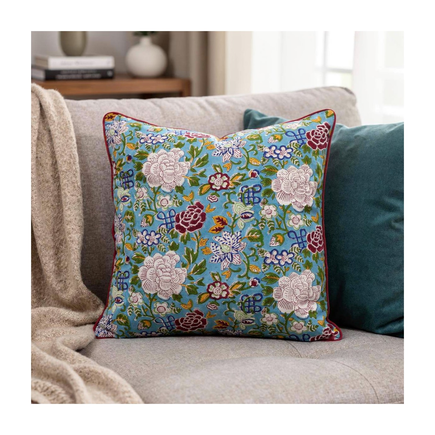 Cette housse de coussin en coton Jade séduit par son imprimé floral délicat. Les fleurs stylisées et les feuillages apportent fraîcheur et douceur à votre décoration. Son passepoil rouge souligne élégamment les contours et met en valeur le motif.