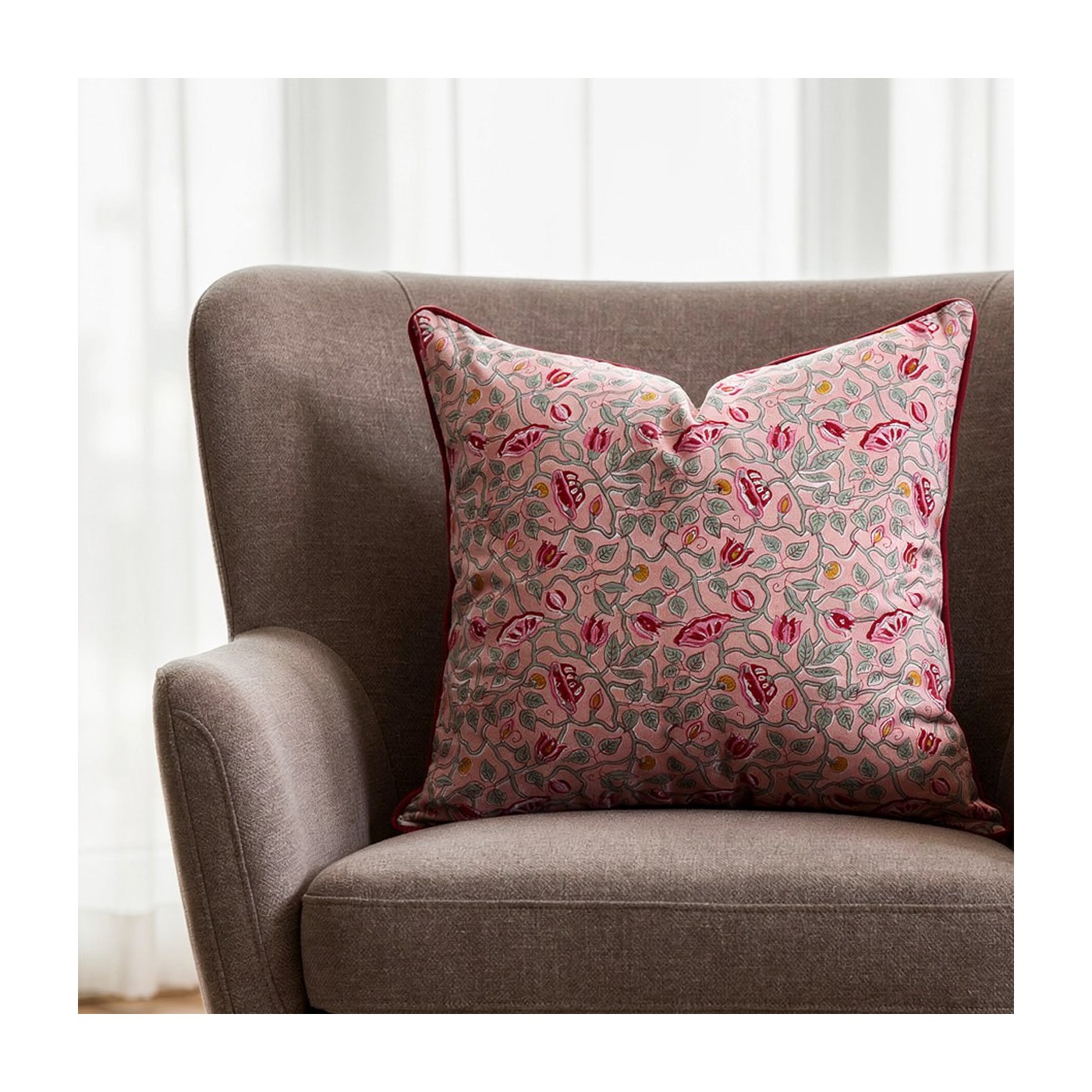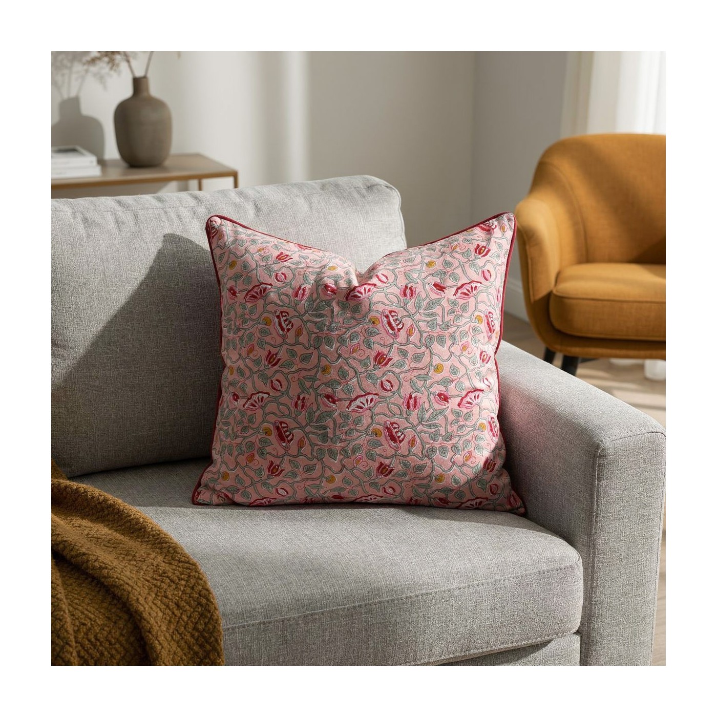 Cette housse de coussin en coton Sarina séduit par son imprimé floral délicat. Les fleurs stylisées et les feuillages apportent fraîcheur et douceur à votre décoration. Son passepoil rouge souligne élégamment les contours et met en valeur le motif.