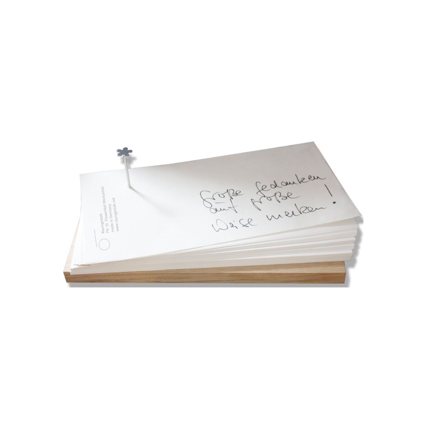Un bloc-notes cloué avec une petite fleur à un socle de Bois Naturel...