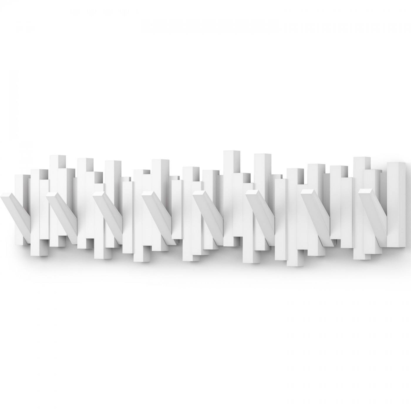 La Patère Sticks Multi Hook créée pour Umbra possède 5 crochets escamotables. Un porte-manteaux idéal pour tous vos Vêtements, Sacs ou Accessoires. Avec les 5 crochets remontés, on obtient une décoration murale discrète et très graphique. Existe en quatre finitions : Blanc, Espresso, Gris et Noir