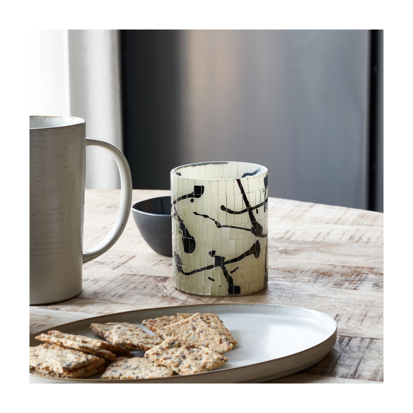 Vana de House Doctor est un grand photophore avec un motif noir et blanc en mosaïque.