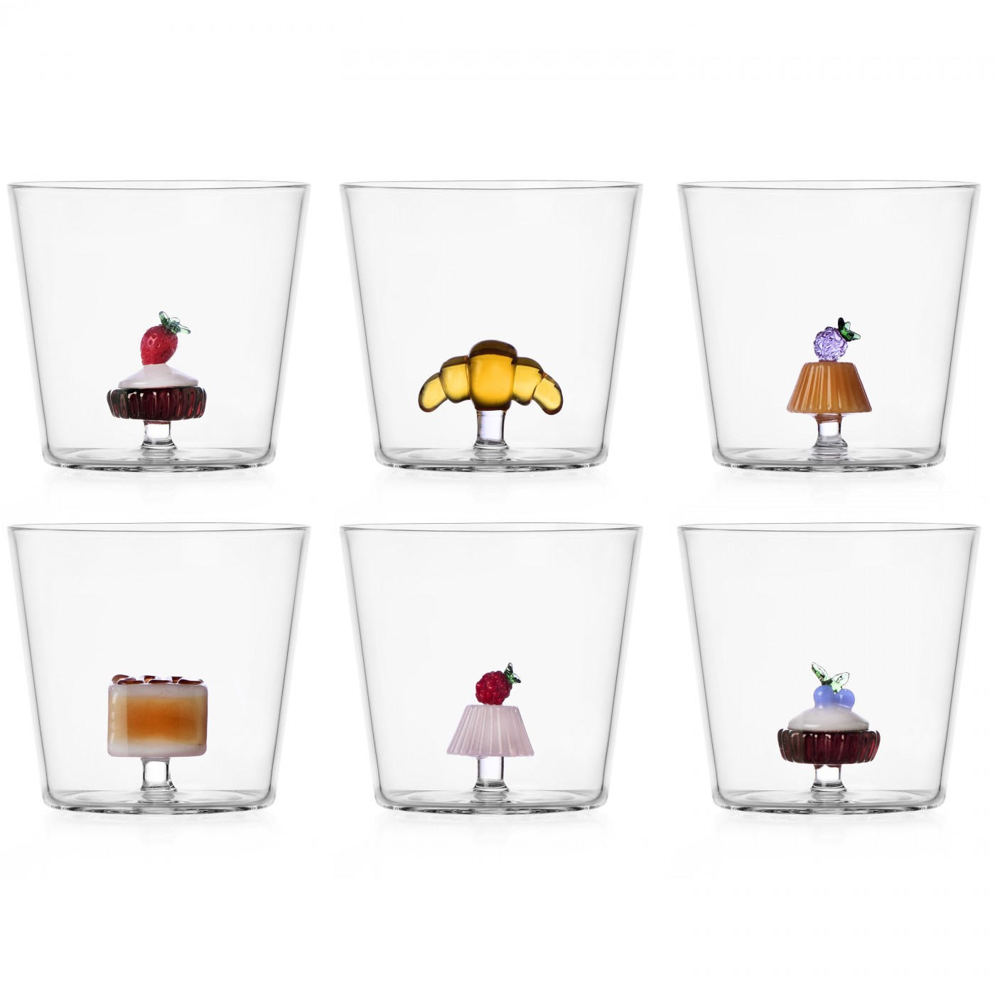 Succombez à la gourmandise avec le lot de 6 verres de la collection Pâtisserie d’Ichendorf Milano. Chaque pièce en verre soufflé révèle une pâtisserie miniature délicatement façonnée : charlotte aux fraises, croissant, millefeuille et autres douceurs emblématiques.